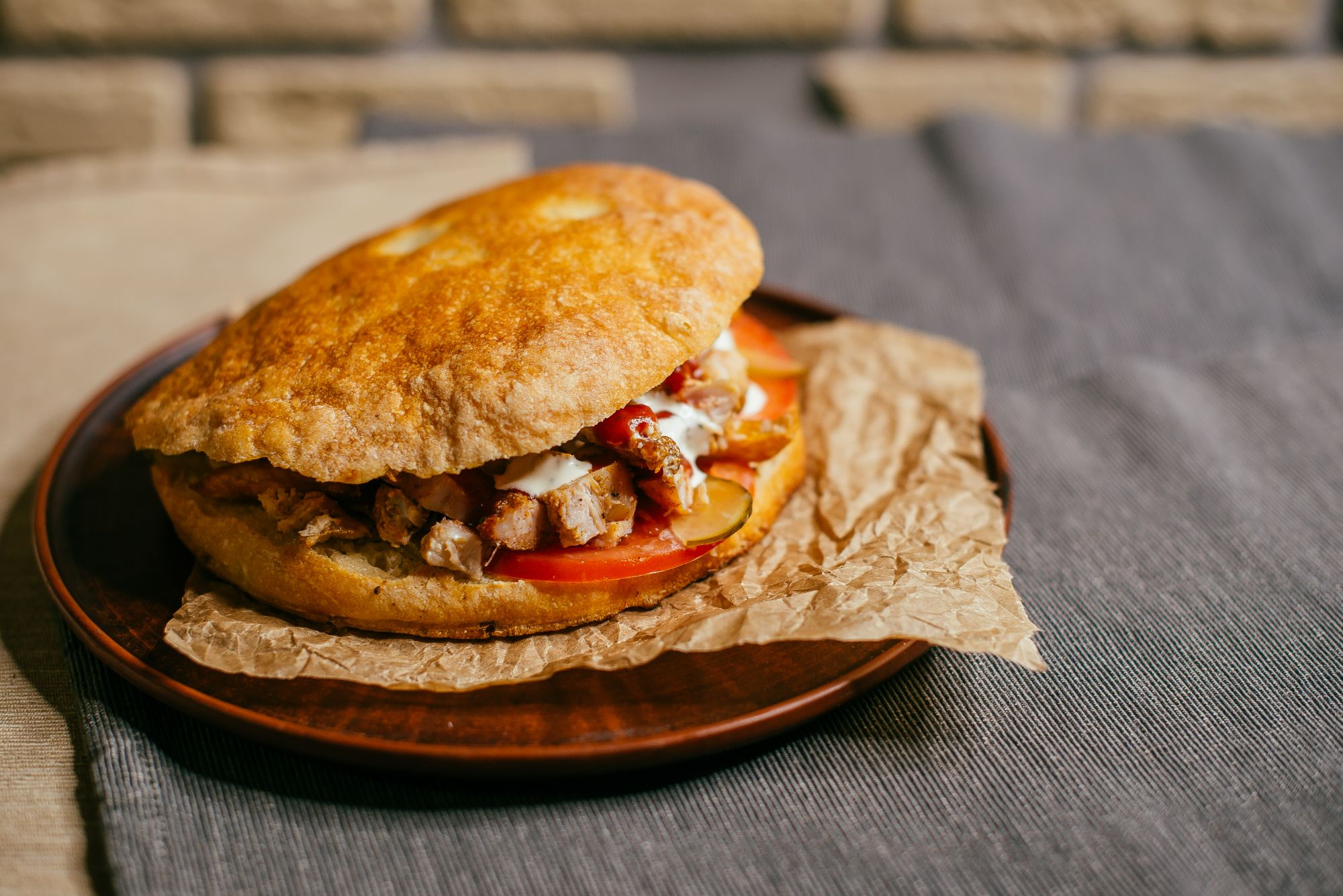 Ciabatta, szarpane mięso, warzywa (pomidor, ogórek swierzy i kieszony,papryka,szczepiorek Surówka z kapusty i salaty lodowej),, sos
